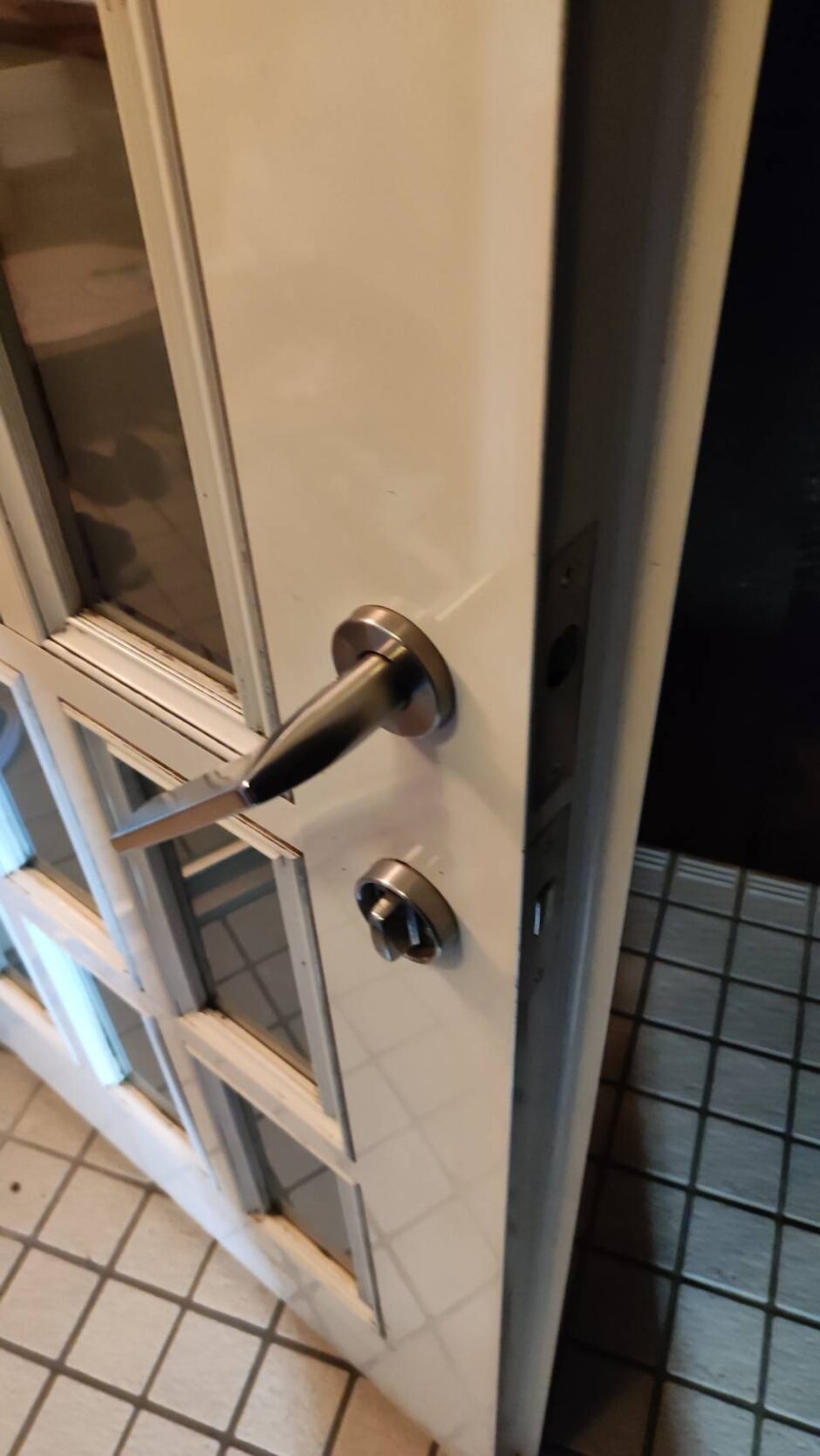 交換後は、下がっていたドアノブもきれいに水平へ戻りました。ラッチ内部のバネもしっかり効いており、スムーズに開閉できるようになっています。